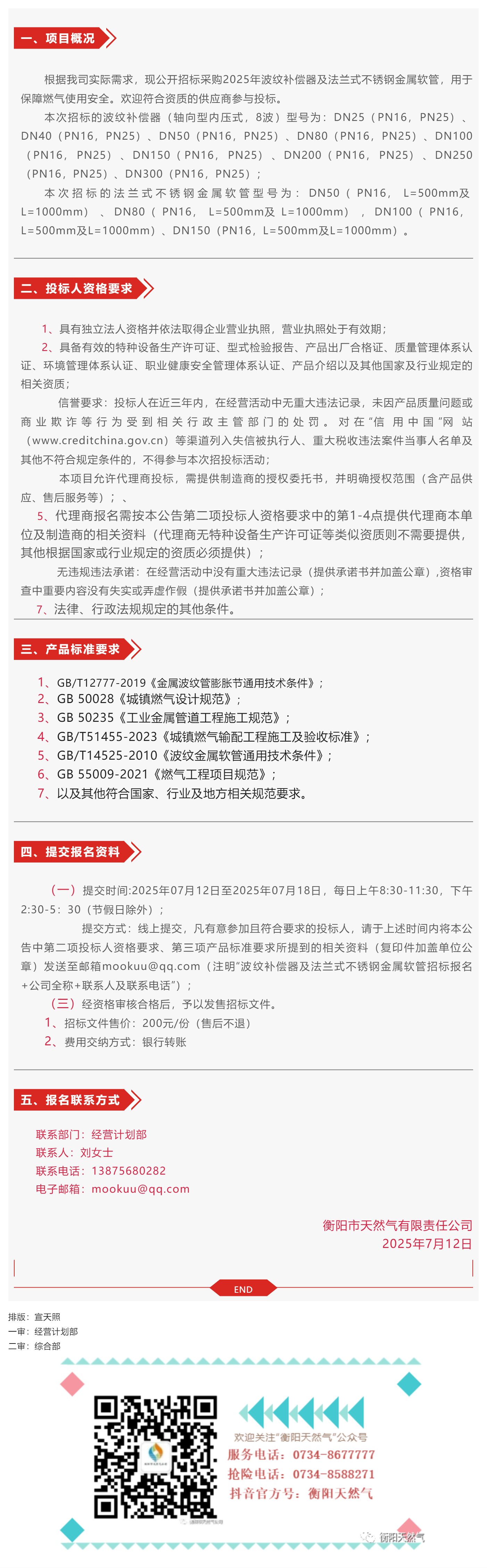 招標(biāo)公告丨衡陽市天然氣有限責(zé)任公司2025年波紋補(bǔ)償器及法蘭式不銹鋼金屬軟管采購招標(biāo)公告